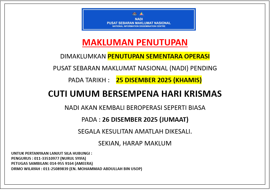 ๐ข ๐ก๐ข๐ง๐๐ฆ ๐ฃ๐๐ก๐จ๐ง๐จ๐ฃ๐๐ก ๐ฆ๐๐ ๐๐ก๐ง๐๐ฅ๐ Sukacita dimaklumkan bahawa NADI Pending akan ditutup pada 25 Disember 2025 (Khamis) sempena sambutan Hari Krismas. Operasi akan disambung semula seperti biasa pada 26 Disember 2025 […]